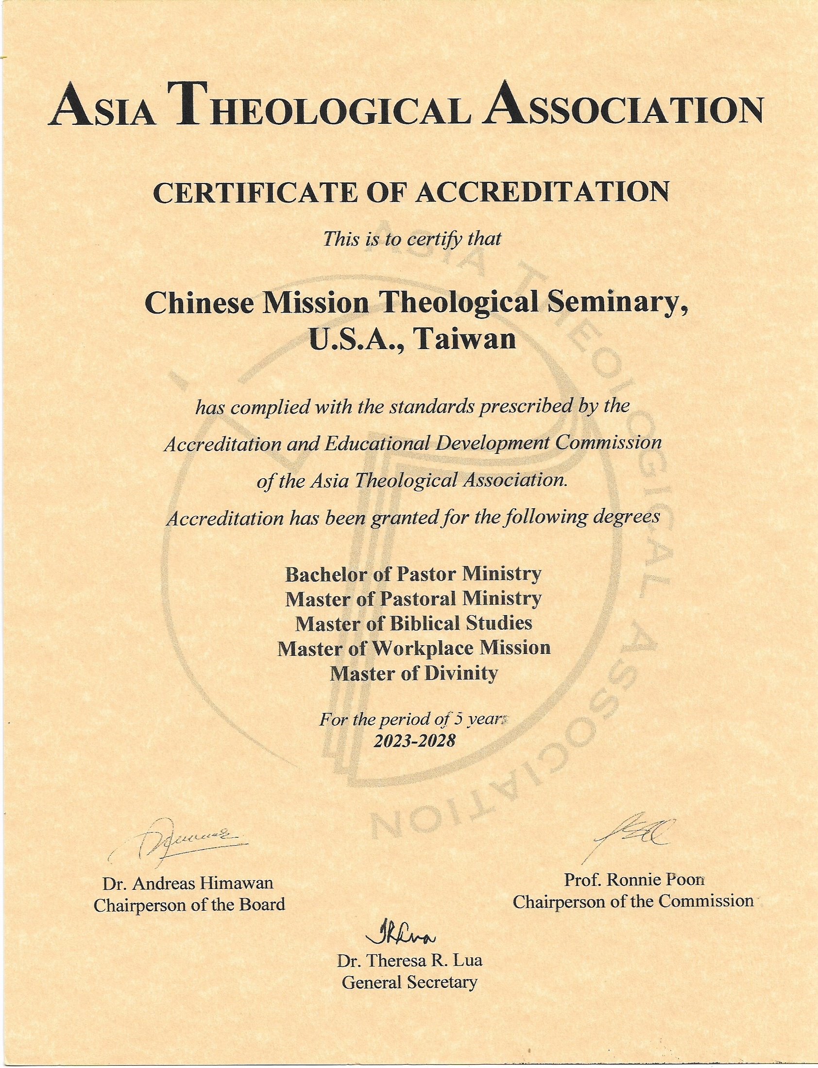 本校通過「亞洲神學協會」ATA評鑑。台灣地區雖有眾多神學教育機構,但僅有為數不多的正規神學院通過此一評鑑,得到國際的認證。