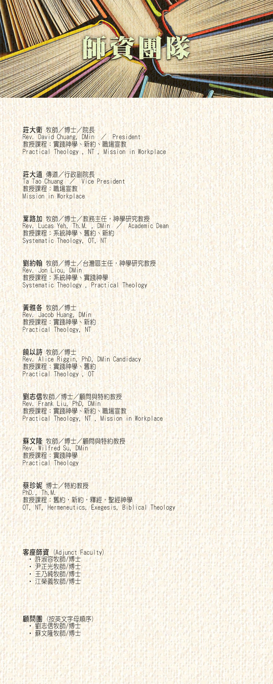 在過去的日子裡,我們邀請匯集了許多華人優秀師資一同投入神國人才的培訓大業,至今仍然在持續邀請與更新師資團隊。